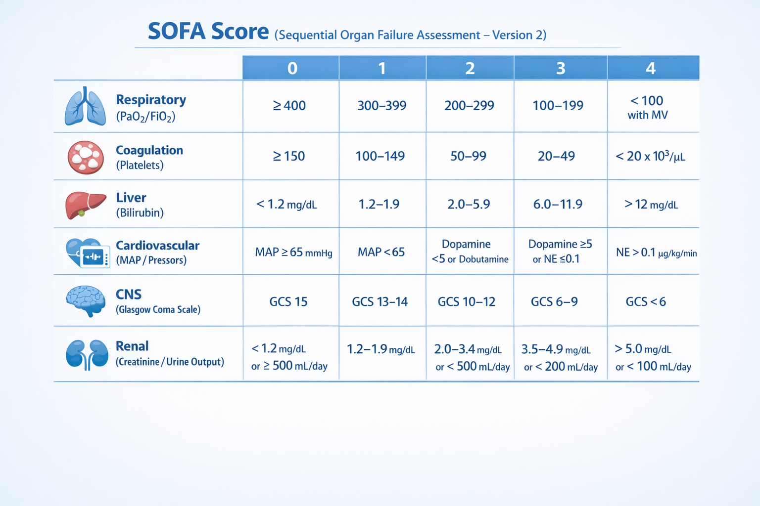 SOFA-2 retains the six-organ system structure with a total score ranging from 0 to 24; however, the scoring thresholds and clinical variables have been substantially refined.