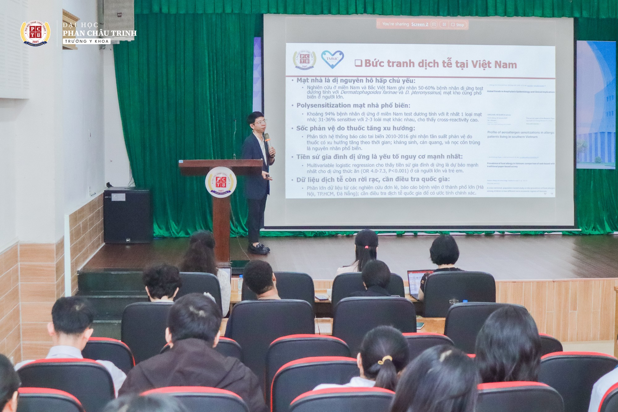 Mở đầu chuỗi báo cáo, TS. Phan Lê Minh Tú – Giám đốc Trung tâm Nghiên cứu và Ứng dụng Y sinh, Trưởng nhóm nghiên cứu Tế bào gốc tại Trường Đại học Phan Châu Trinh đã mang đến cái nhìn toàn cảnh với chuyên đề: “Xu hướng dịch tễ và đột phá trong chẩn đoán dị ứng”. Bài chia sẻ đã làm rõ những thay đổi trong mô hình bệnh dị ứng- hen phế quản hiện nay và các công nghệ mới giúp nhận diện mô hình mẫn cảm phức tạp nhằm điều trị chuẩn xác và cá thể hóa.